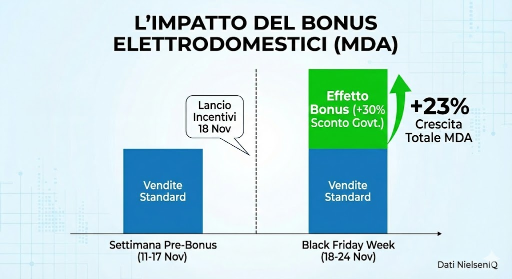 - Grandi Elettrodomestici – MDA (+23%): Qui la “mano invisibile” è quella dello Stato. L’impatto del “Bonus Elettrodomestici 2025”, attivo dal 18 novembre con sconti fino al 30% per i prodotti ad alta efficienza, ha creato una tempesta perfetta. I consumatori hanno cumulato lo sconto governativo con le promozioni dei retailer, sbloccando acquisti di sostituzione (lavatrici, frigoriferi) che erano stati rimandati a causa dell’inflazione.