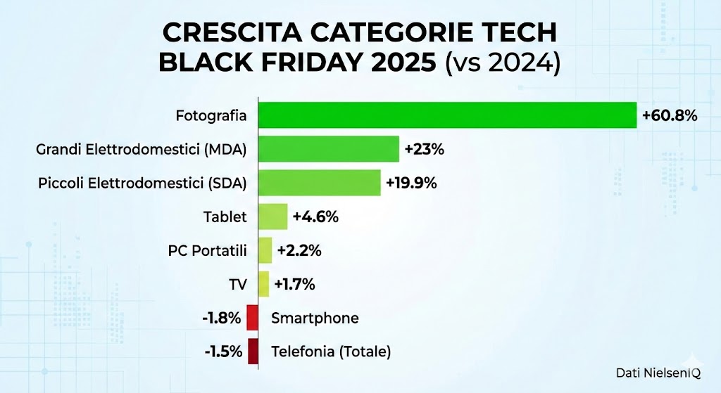 - Telefonia (-1,5%) e Smartphone (-1,8%): Il dato è in controtendenza rispetto alla storia del Black Friday. La flessione degli smartphone, categoria regina per volumi, è un campanello d’allarme. Potrebbe indicare una saturazione del mercato, cicli di sostituzione che si allungano oltre i 30 mesi o una percezione di scarsa innovazione nei modelli di fascia media, tipicamente i più venduti durante queste promozioni.